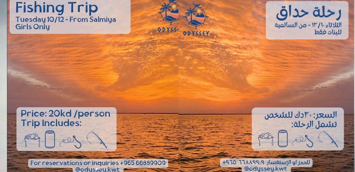 Fishing trip on Tuesday, 12/10 from Salmiya for girls only. The trip starts at 4:30 PM and ends at 10 PM. The package includes fishing equipment, drinks, and snacks. The boat has a restroom. Price per person: 20 KWD. The captain is Kuwaiti. For reservations and inquiries, call 66889909. #Island #UmAlMaradim #Fishing #Yacht #Kuwait